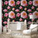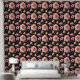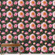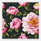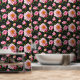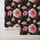 Un hermoso patrón de repetición sin costuras con flores de peonía grandes y pequeñas oscuras y rosas claras en flor total con estambres amarillos de mostaza dorada, ambientado con un fondo negro que tiene hojas de olivo verdes alrededor de las flores. Este audaz y elegante diseño inspirado en el prado de campo tiene un toque de verano/primavera intemporal y elegante. Transforme cualquier habitación en un majestuoso y majestuoso escaparate con este diseño adaptado a cualquier espacio grande, ya sea sala de estar, cuarto de baño o dormitorio. Ideal para casas de campo, cabañas, casas y ambientes de negocios en inglés y francés.