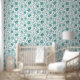 Diseño de gran superficie de estilo jacobino en contrastes de teales/óvulos de pato sobre fondo blanco.