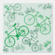 Un revoltijo de bicicletas verdes grandes y pequeñas sobre un fondo verde claro.