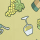 Vino blanco. Botella, vidrio, corcho y uvas. Patrón sin foco. Color de fondo personalizado.