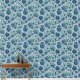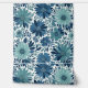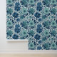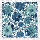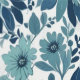 Este diseño presenta un diseño floral vibrante y elegante, compuesto por flores grandes y estilizadas en diferentes tonos azules y verde azulados. Las flores están muy detalladas con líneas finas y cúmulos de puntos centrales, rodeadas por una serie de ramas frondosas y flores más pequeñas. El contraste, con un fondo blanco limpio, realza la paleta de colores fría y relajante, haciendo que el diseño sea fresco y sofisticado. Esto evoca una sensación de belleza natural y serenidad, perfecta para textiles, papel pintado o papelería.