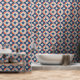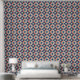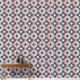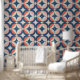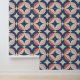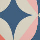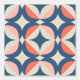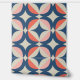 Este diseño moderno de mediados de siglo presenta un diseño geométrico azul y coralino.