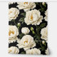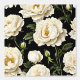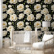 Un hermoso patrón repitiendo sin fisuras de pared a pared de flores de peón de color blanco roto con estambres de oro mostaza en plena flor, ambientado en un fondo negro que tiene pequeñas hojas verdes y peones alrededor de la flor. Este audaz y elegante diseño inspirado en el prado de campo tiene un toque de verano/primavera intemporal y elegante. Transformar cualquier habitación en una majestuosa y majestuosa obra maestra con este diseño adaptado a cualquier espacio grande, ya sea sala de estar, baño o dormitorio. Ideal para casas de campo, cabañas, casas y ambientes de negocios en inglés y francés.