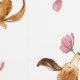 Playas cachorros de dachshund con flores rosadas sobre fondo blanco. Ideal para niños en sala de juegos, salón de belleza y dispensarios de veterinaria ©OctopusArts & DecampStudios