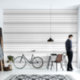 Este papel pintado de pellejo y palo presenta una banda gris oscura y un patrón rayado gris claro y blanco