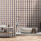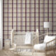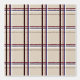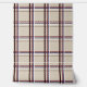 A tartan pattern in neutral, warm colors. Red, blue, and cream-colored bands run accross a muted pale tan background. A very fall aesthetic with a mix of rich and muted colors.