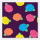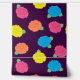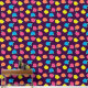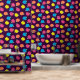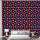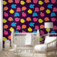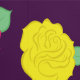 Los rosas estilizados, de color rosa neón brillante, azul, amarillo y coral con hojas verde neón, se esparcen a través de un fondo violeta profundo para crear un divertido patrón floral.