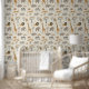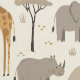Bring the magic of the savanna to a child's space with this charming all-over wallpaper. The pattern features friendly, stylized safari animals, including the lion, giraffe, elephant, zebra, and hippo, playfully arranged alongside acacia trees and a rising sun. The soft, neutral color palette and creamy background create a light, cheerful, and gender-neutral environment. Perfect for an accent wall or an entire room to encourage imagination and happy dreams. Search ID1259 to see other products with this cute safari pattern. Note: design adapted from generative content.