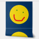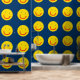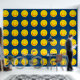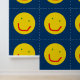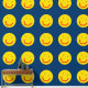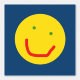 Un sol amarillo de ojos verdes sonriendo sobre un fondo azul.
