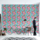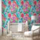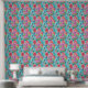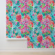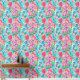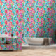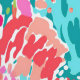 Un patrón sin costura con flores rosadas, naranjas, corales y rojas sobre un fondo verde minado, adornado con salpicaduras de pintura redonda y puntos blancos. El diseño tiene un aspecto pintado a mano, combinando elementos florales vibrantes con exquisitos salpicaduras para crear un ambiente animado y elegante.