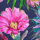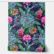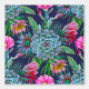 Suculentos tropicales exóticos color agua, cactus y plátanos dejan flores en el jardín sobre un fondo azul oscuro.
