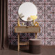 Muted taupe grey foundation accented with ornate pastel scrolls.