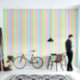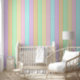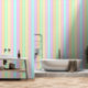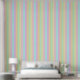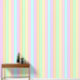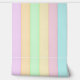 El diseño de este fondo de papel de rayas tropicales combina tonos azules y verdes con tonos rosados, amarillos, naranjas y violetas. Tiene un aspecto luminoso y resplandeciente, como toldos y sombrillas de playa que brillan bajo la cálida luz del sol.