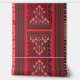 El diseño parece ser un diseño textil, posiblemente para tela o papel pintado. Aquí hay una descripción detallada: Sección superior: Tiene un fondo rojo con franjas verticales en blanco y negro, intercalado con patrones intrincados que se asemejan a diseños tradicionales o tribales. Banda central: Esta sección presenta formas de zigzag y diamante en negro, blanco y tonos marrones, flanqueados por finas franjas verticales. Sección inferior: Muestra un patrón ornamentado, paisajista en tonos rojos con un motivo central prominente que refleja la forma de la parte superior pero con detalles más elaborados. El diseño es bastante complejo y llamativo desde el punto de vista visual, con una mezcla de motivos geométricos y orgánicos. Podría ser culturalmente importante, especialmente en el contexto del diseño textil.