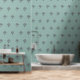 Añada un punto focal apacible a sus paredes con un fondo de paredes de piel y palo de moda con un elegante árbol asiático florido con flores de color verde azulado con flores de ciruela.