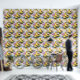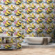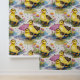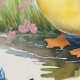 Naranja de color de agua para bebés mallard maullido en los charcos de lluvia con un paraguas rosado y flores.