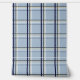 A plaid tartan pattern in calming muted neutral colors. Stripes in yellow, gray, white, and navy blue are arranged on a slate blue-gray background.