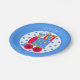 Plato de papel colorido para ducha de bebé, hecho en azul, con un centro de lunares azules y blancos y una locomotora de tren choo choo roja, azul, verde y amarilla en el medio. Personalice el texto arqueado blanco según sus necesidades. Están disponibles invitaciones y servilletas de papel a juego.