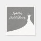 Un tipo de letra blanco brillante y un vestido de novia elegante sobre un fondo de tela gris ilustrado acentúan esta servilleta para ducha de novia, haciéndola perfecta para un tema de campo, western, boho, invierno u otoño. Se coordina perfectamente con la Colección de Ducha de Novia Elegante en tela gris.