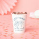Vasos de papel para despedida de soltera Último Brindis en azul polvoriento con personalización. Perfecto para un fin de semana de despedida de soltera en la playa