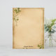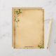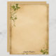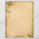 Papel pergamino antiguo con un tono dorado, borde ornamental y decorado con enredaderas y hojas verdes en las esquinas superior izquierda e inferior derecha. Hermoso y delicado, un poco desgastado, con apariencia vintage y desgastado por el tiempo, y aún elegante.