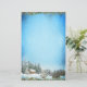 Esta papelería de Navidades acuáticos presenta un paisaje invernal nevado y tranquilo, con una cabaña enclavada en el bosque, y el cielo cubierto de copos de nieve deja mucho espacio para escribir. En la parte superior e inferior, la vegetación es festiva.