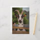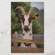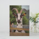 Fotografía de una cabra blanca y negra con cuernos de pie contra una valla.