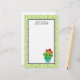 Papelería con tu nombre personalizado. Un lindo ilustracion de un cactus verde sentado en una maceta de flores. Grandes ojos kawaii y con sombrero rojo. El fondo es un patrón con remolinos de color verde cal con un marco blanco sobre la parte superior para escribir en el interior.