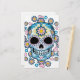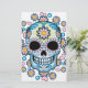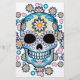 Los tonos azules y rosas del cráneo de azúcar están rodeados de flores y corazones coloridos.