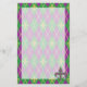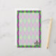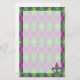 Un patrón de arlequín de verde y púrpura se transforma en un estilo lúdico con una superposición de contornos de diamante dorado y fleur de lis, creando un patrón divertido y colorido perfecto para cualquier celebración del Mardi Gras influenciada por Nueva Orleans. En la esquina inferior de la papelería hay un flor de lis con motivos para crear un toque más agradable.