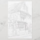 Dibujo blanco y negro de una casa inglesa de dos pisos