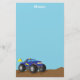 Efectos de escritorio para los muchachos con un monster truck azul fresco que compite con con un icono de la iluminación en el lado, compitiendo con en el terreno rocoso. Para los niños que aman los coches y los vehículos de competición.