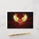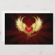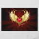 Corazón rojo brillante de un ángel con alas doradas brillando en el fondo rojo oscuro y radiante decorado con un patrón.
