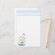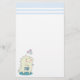 Estacionería con un lindo dinosaurio sonriente, mejillas rosadas y RAWR escrito en su vientre. 3 coloridas estrellas felices sobre su cabeza. El borde superior tiene un patrón azul claro y blanco de puntos y rayas de polka.