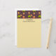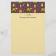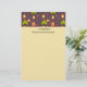 Escribir papel con un patrón a lo largo de la frontera superior y su nombre personalizado. Diseñado con un divertido patrón temático de camping. Sobre un fondo marrón rojizo. Los elementos en el patrón incluyen una fogata, una tienda, una guitarra, una pala y una mochila.