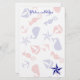 Una divertida combinación de caballitos de mar, veleros, ballenas, anclas y estrellas. Los objetos de fondo son de color rojo y azul.