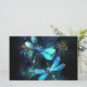 Dos libélulas transparentes, luminosas, turquesas, dibujadas de forma artística sobre el fondo nocturno con algas lacustres luminosas y luciérnagas. Flauta de dragón resplandeciente.