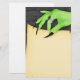 La mano de la bruja verde de las características de los efectos de escritorio de Halloween de la diversión con los clavos negros largos que sostienen el pergamino mira el papel. Fondo gris oscuro de la pared de ladrillo. Un cierto graphics© http://www.delightful-doodles.com/