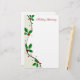 Papel de escribir festivo del día de fiesta, con un filamento del acebo corriendo abajo del lado izquierdo de los efectos de escritorio. Saludos del día de fiesta en texto rojo de la escritura en el top. Personalizar para añadir el texto adicional o el uso en su propia impresora en casa. Papel precioso para su letra anual del navidad.