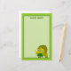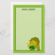 Este papel personalizado lindo de los efectos de escritorio de los niños del dinosaurio tiene un Triceratops del dibujo animado en el frente. Tiene tres cuernos y está comiendo algunas hojas verdes. El documento de información es verde con una frontera verde.