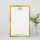 Un gran monograma negro está en la parte superior. Una línea de texto para mostrar en negro está debajo del monograma del nombre. En la parte inferior hay dos líneas de texto en negro. Puede editar ese texto para mostrar información de contacto, como un número de teléfono, una dirección de correo electrónico y una dirección de calle. Todo el texto se puede editar o eliminar. Esta papelería profesional tiene una frontera de oro falsa. (La frontera no está hecha de Relieve metalizado.)