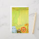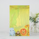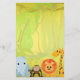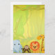 Una escena de la selva de la diversión con los árboles, vides, y un río como el fondo y un elefante, un mono, un león y una jirafa mirando encendido. Resumido en un purpurina como marco. Grande para una fiesta de bienvenida al bebé del muchacho o del chica.