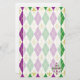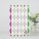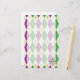 Los brillantes diamantes de color violeta y verde, recubiertos de diamantes de color dorado, y el flur de lis recuerdan la juerga y las celebraciones asociadas con el mardi gras de Nueva Orleans, mientras que una base crema aporta un toque de refinamiento a este patrón de argyle. En la esquina inferior de la papelería hay un flor de lis con motivos para crear un toque más agradable.