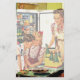 Escena de la vida diaria de un ilustracion de época con una familia con mamá y los niños en la cocina a punto de tomar un aperitivo por la tarde con botellas de refrescos y galletas recién horneadas. La puerta del refrigerador está abierta y papá está entrando de un largo día duro en el trabajo.
