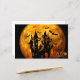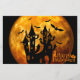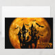 Este diseño presenta un feliz saludo de Halloween con una imagen de luna llena iluminada en un espeluznante tono de naranja brillante. También se puede ver una casa embrujada y murciélagos volando en el aire. Junto al texto hay dos pequeñas imágenes: una de un gato y otra de una calabaza, ambas asociadas con Halloween.