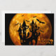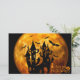 Este diseño presenta un feliz saludo de Halloween con una imagen de luna llena iluminada en un espeluznante tono de naranja brillante. También se puede ver una casa embrujada y murciélagos volando en el aire. Junto al texto hay dos pequeñas imágenes: una de un gato y otra de una calabaza, ambas asociadas con Halloween.