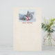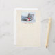 Papel de papelería con una linda fotografía de Navidad de un gato atigrado gris mordiendo juguetonamente un sombrero rojo de Santa. Sus grandes patas esponjosas hacen que esta foto sea extra deliciosa. Debajo de la foto está el texto: Meowy Navidad. Fondo con aspecto de pergamino falso.
