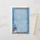 La estacionería tiene un divertido patrón de natación de peces en azul. Pescador y pescador con su palo de pesca y otros aparejos.