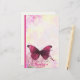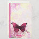 Una hermosa mariposa púrpura que cautiva tu atención. Se encuentra sobre un delicado fondo que tiene una textura acuarela única y creativa con románticas flores rosadas y amarillas descoloridas. Con un logo antiguo apenas visible en la parte inferior para darle un toque de época. Al final de esta papelería hay una pequeña cita que dice: Sé tu propio tipo de hermosa.