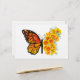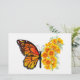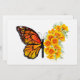 Orange, detailed monarch butterfly with wing decorated with yellow, vibrant California poppy on white background.